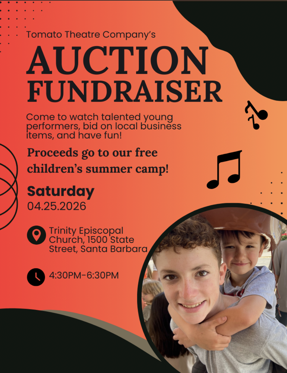 Founded by high school students in 2020, Tomato Theatre Company is dedicated to providing affordable theatre education to youth in the Santa Barbara community. On Sunday, April 25th, the nonprofit will be holding a fundraiser at Trinity Episcopal Church (1500 State St.) to support their mission. The fundraiser is a free-admission event that will include performances from both the youth who participate in the program and the teens who run it. Attendees can also look forward to a silent auction, refreshments, games, and plenty of donation opportunities. Doors will open at 4:30 p.m., with performances beginning at 5 p.m. All members of the community are invited and encouraged to attend, so come to support and join in the magic of theatre and community for all ages!