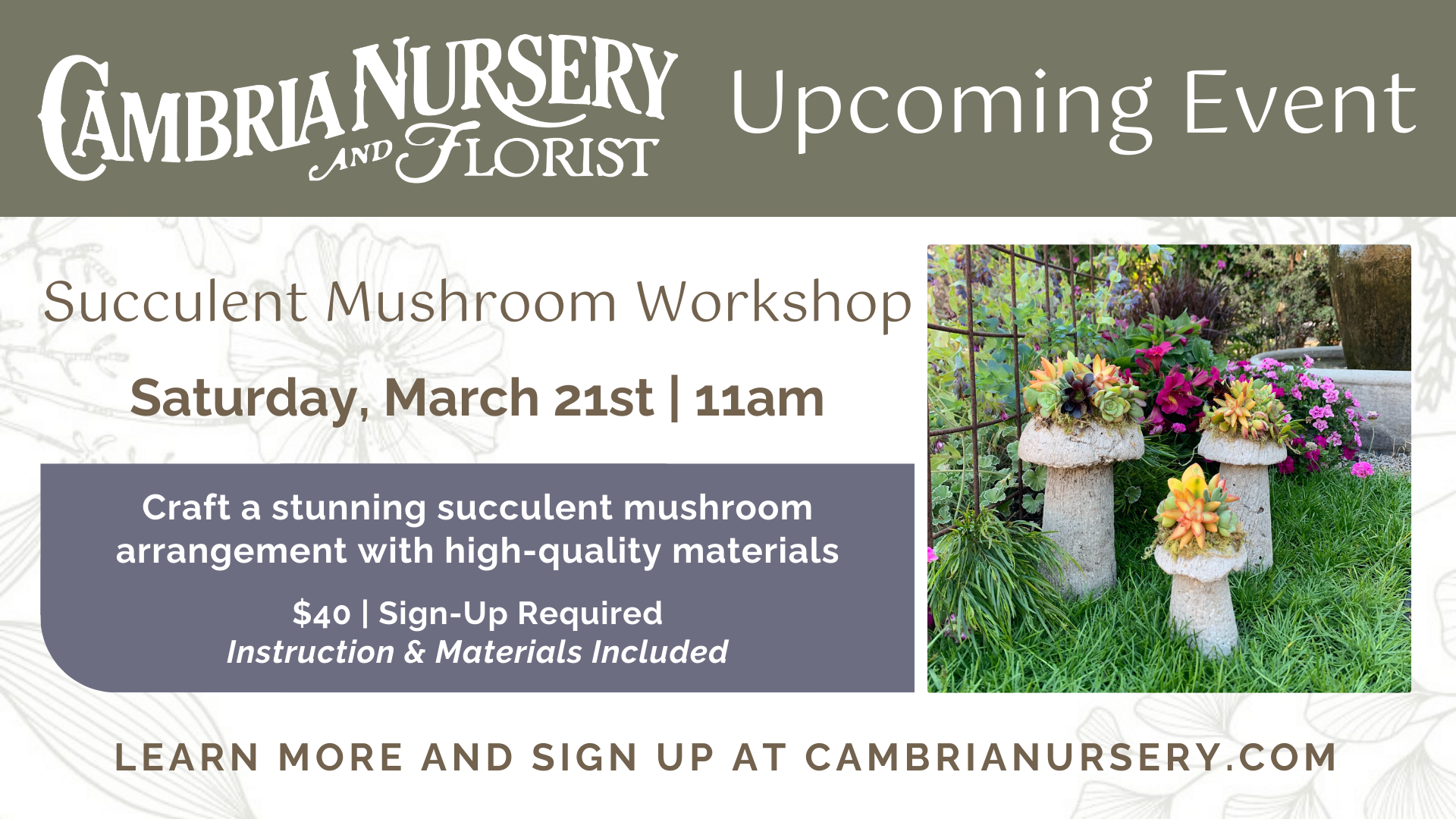 Join us at Cambria Nursery for a hands-on Mosaic Pot Workshop on March 7th at 11am, where you’ll create a one-of-a-kind planter to add charm to your garden or home! In this guided class, you’ll learn the art of mosaic design, arranging colorful tiles and glass pieces to craft a unique, personalized pot. Get ready to create something …