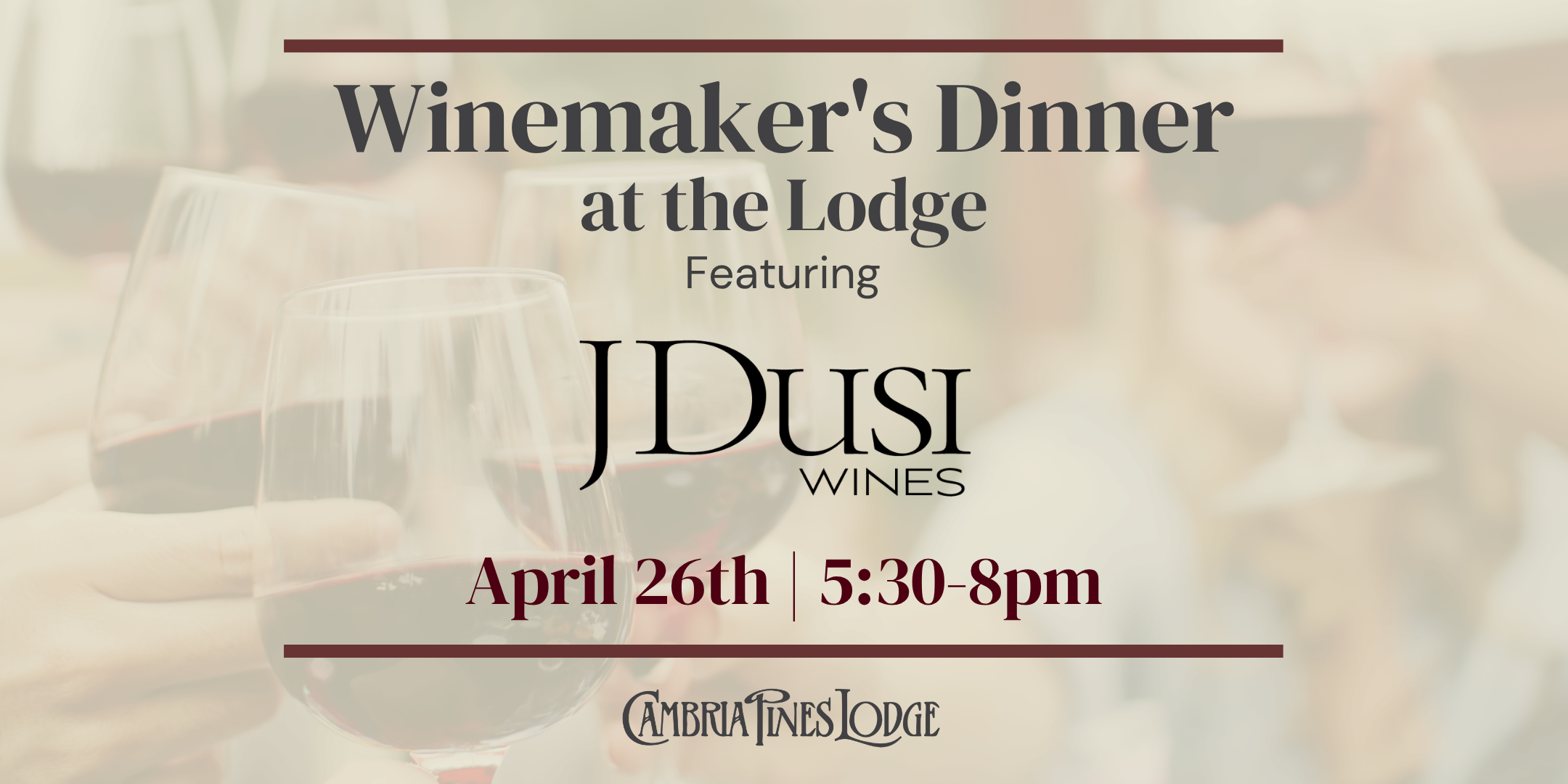 Join us in welcoming J. Dusi Wines to Cambria Pines Lodge for an intimate five-course wine dinner in our outdoor Pavillion Garden. Enjoy a delicious five-course meal paired with hand-selected J. Dusi Wines, guided by a winery expert who will share tasting notes and stories behind each pour. Tickets are $130 per person + tax and must be pre-purchased. Must be 21+ to attend. …